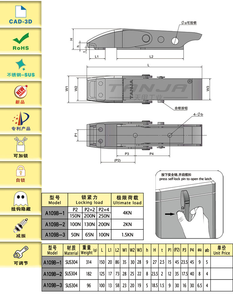 獨特的安全銷可以實現(xiàn)自鎖功能,具有可靠的安全性,搭扣不會因振動松脫